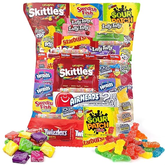 - 🍬ASSORTED CLASSICS FOR EVERY PALATE - The magic continues with Jolly Rancher gummies and hard candies, offering a burst of fruity delight. And let's not forget the chewy goodness of Laffy Taffy in banana, sour apple, cherry, and grape flavors. Swedish Fish miniatures add aquatic charm, while Twizzlers sour and Super Bubble bubble gum contribute a playful twist to this candy extravaganza